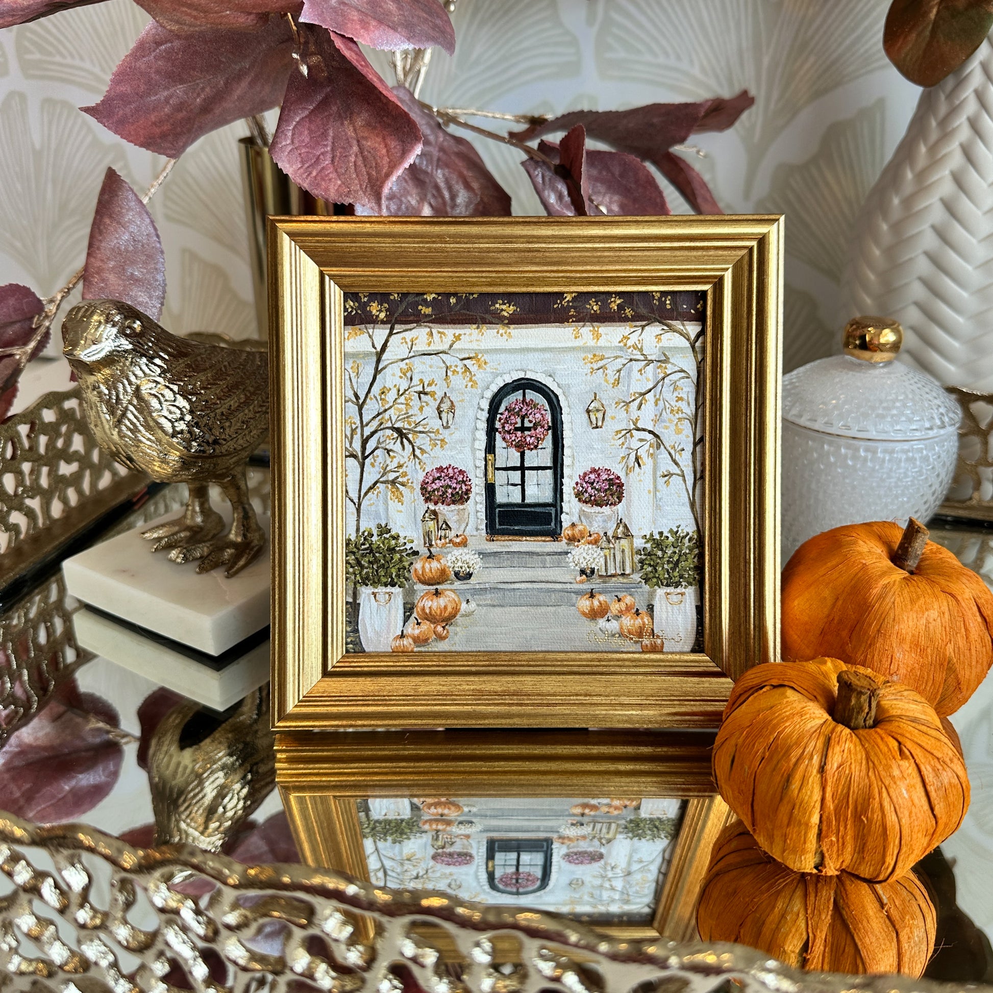 Welcome the beauty of the season into your home with Autumn, a fine art giclée print created from Ashley Salvatori’s original acrylic painting. This charming fall scene features a welcoming front porch adorned with golden trees, heirloom pumpkins, blooming mums, and lanterns glowing with warmth. A classic black door with a floral wreath creates a timeless entryway that feels both elegant and inviting.